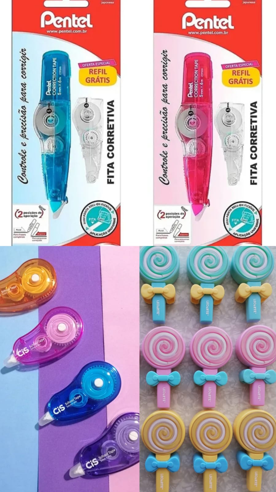 2) Corretivos em fita em formato de pirulito. Design criativo e 3 lindas cores em tons pastéis. Com 6 metros de comprimento e 5mm de largura, proporciona correção instantânea, de fácil aplicação e sem manchas.