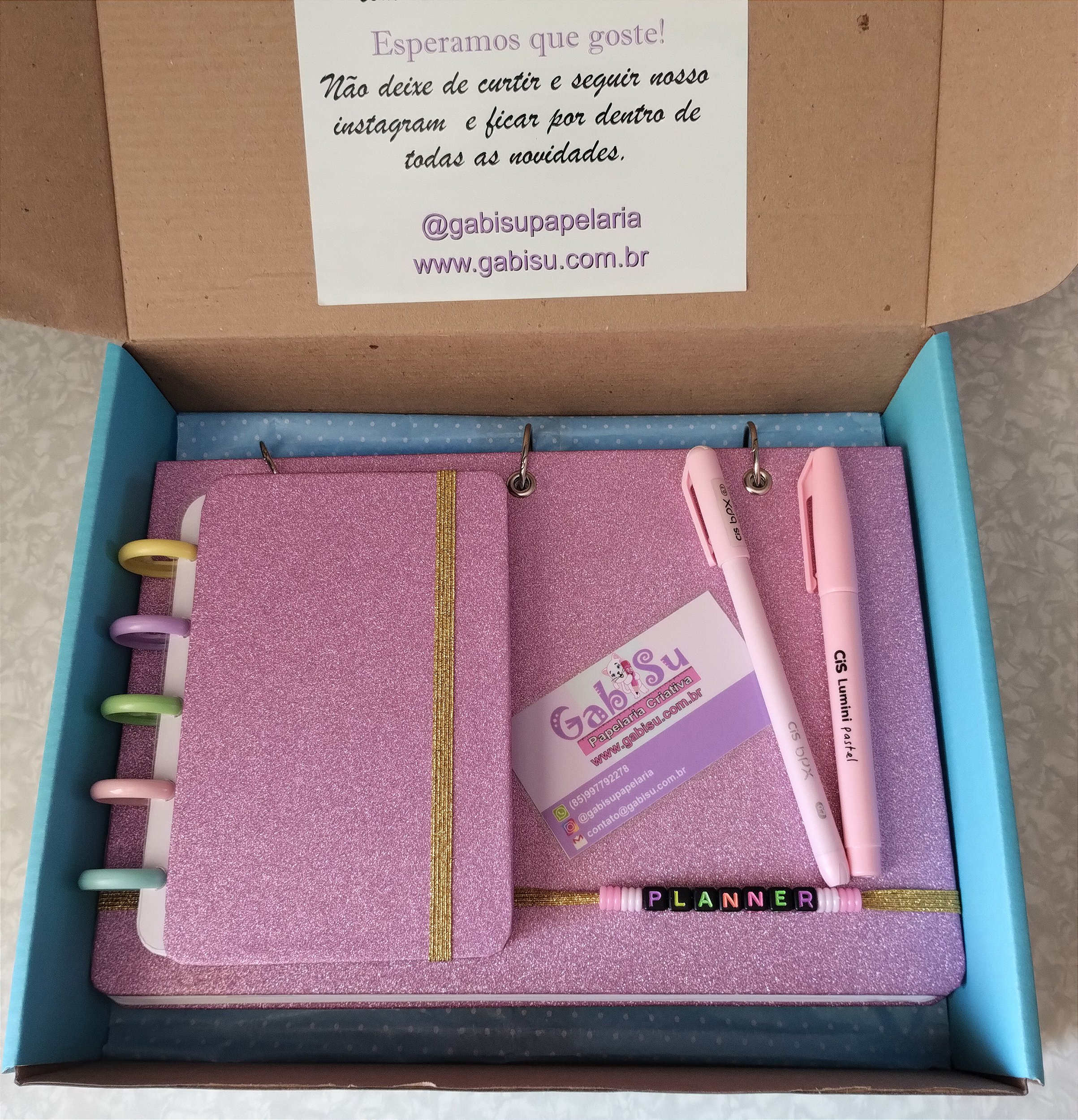 Descrição: A Gabisubox amo você é uma caixa contendo planner, agenda ou caderno a5 conforme a escolha do cliente (com estampa diversificada) acrescida de outros itens selecionados com muito carinho para vc. Serão 4 itens ao total que irão compor a caixa correspondendo ao valor pago pelo cliente.